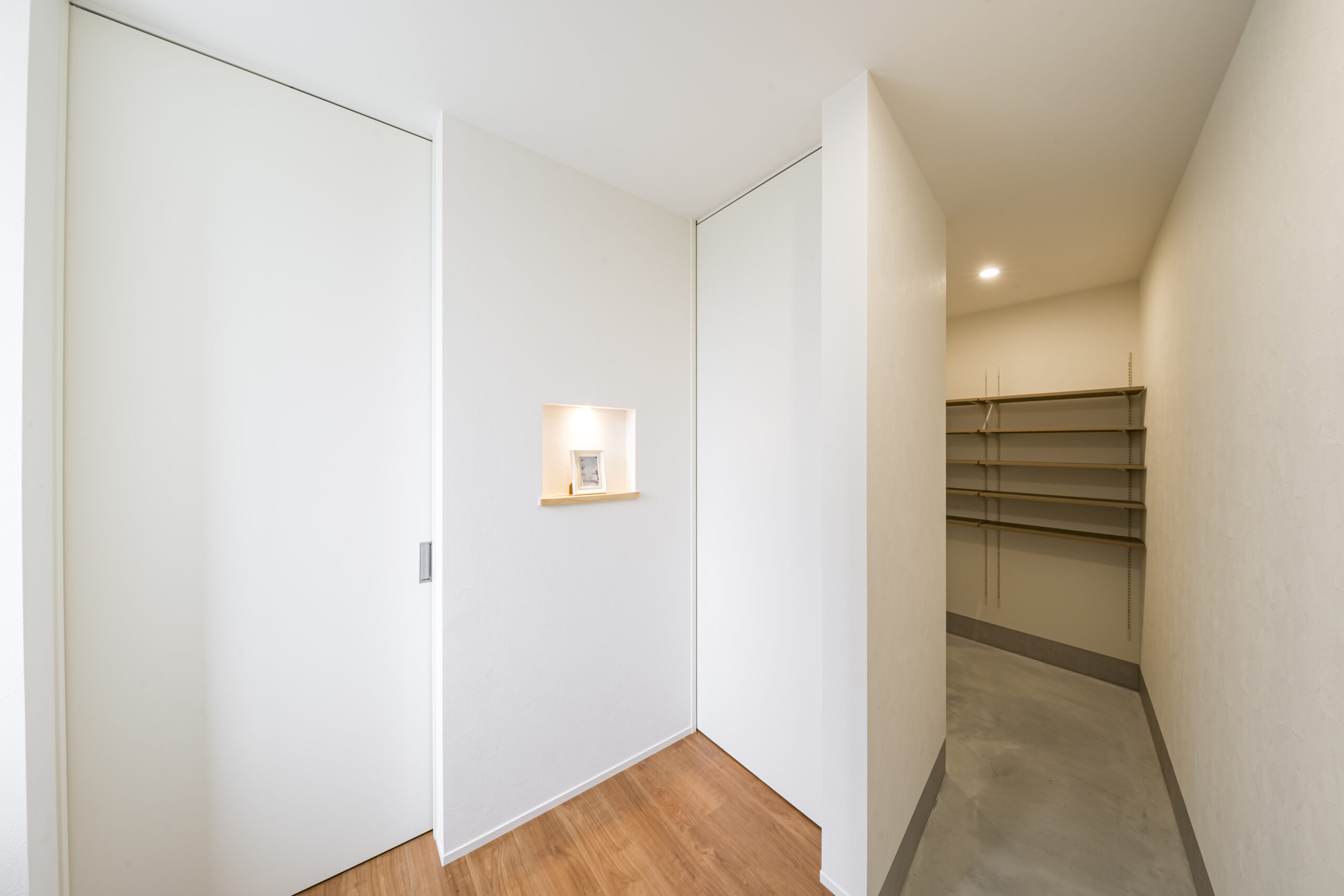 • 玄関/ 出入口が2か所に分かれており、右側はパントリーになっておりその先はキッチンへと繋がっています。ニッチには小さなスポットライトがあり、空間に温かみのアクセントを加えています。