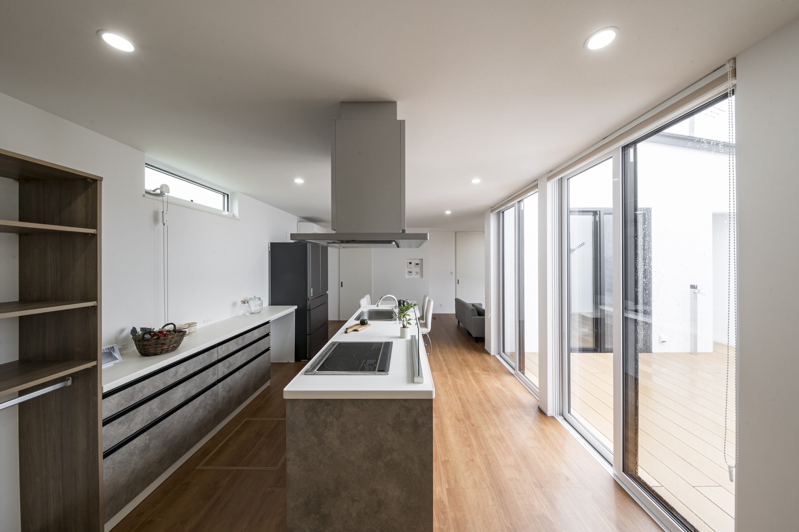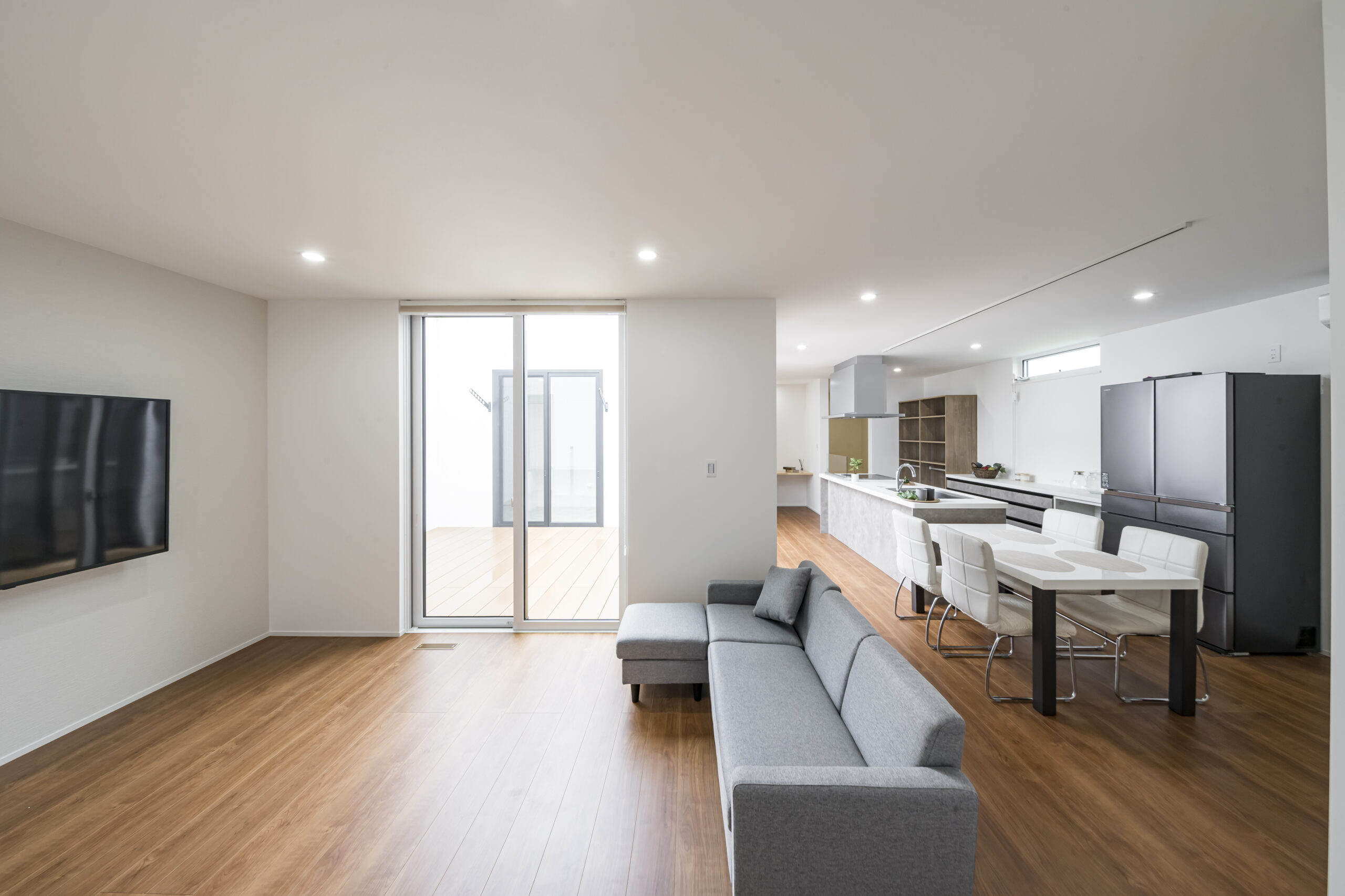 • LDK/ 機能的なデザインと快適さの両方を兼ね備えたLDKとなっており、ガラスの引き戸のため光が差し込み、屋外とのつながりを感じます。 あわせて、部屋を明るく風通しの良い雰囲気に引き立てます。キッチンから中庭の様子が見えるのもポイントです