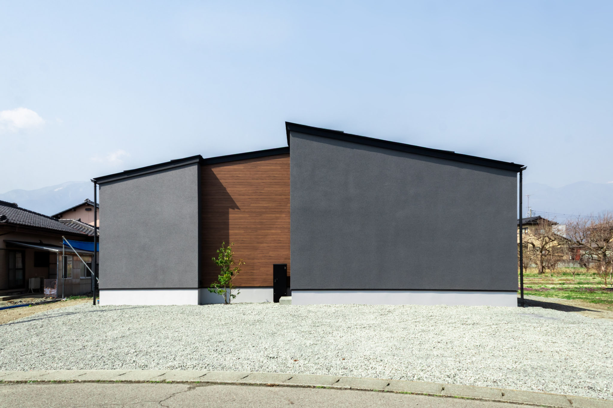 • 外観/ 段違いに重なる片流れ屋根が中央で最も高くなり、落ち着きの中にダイナミックさを生み出しました。外壁はマットなダークグレーで統一し、中央のみ木目の縦張りでアクセントを付けています。
