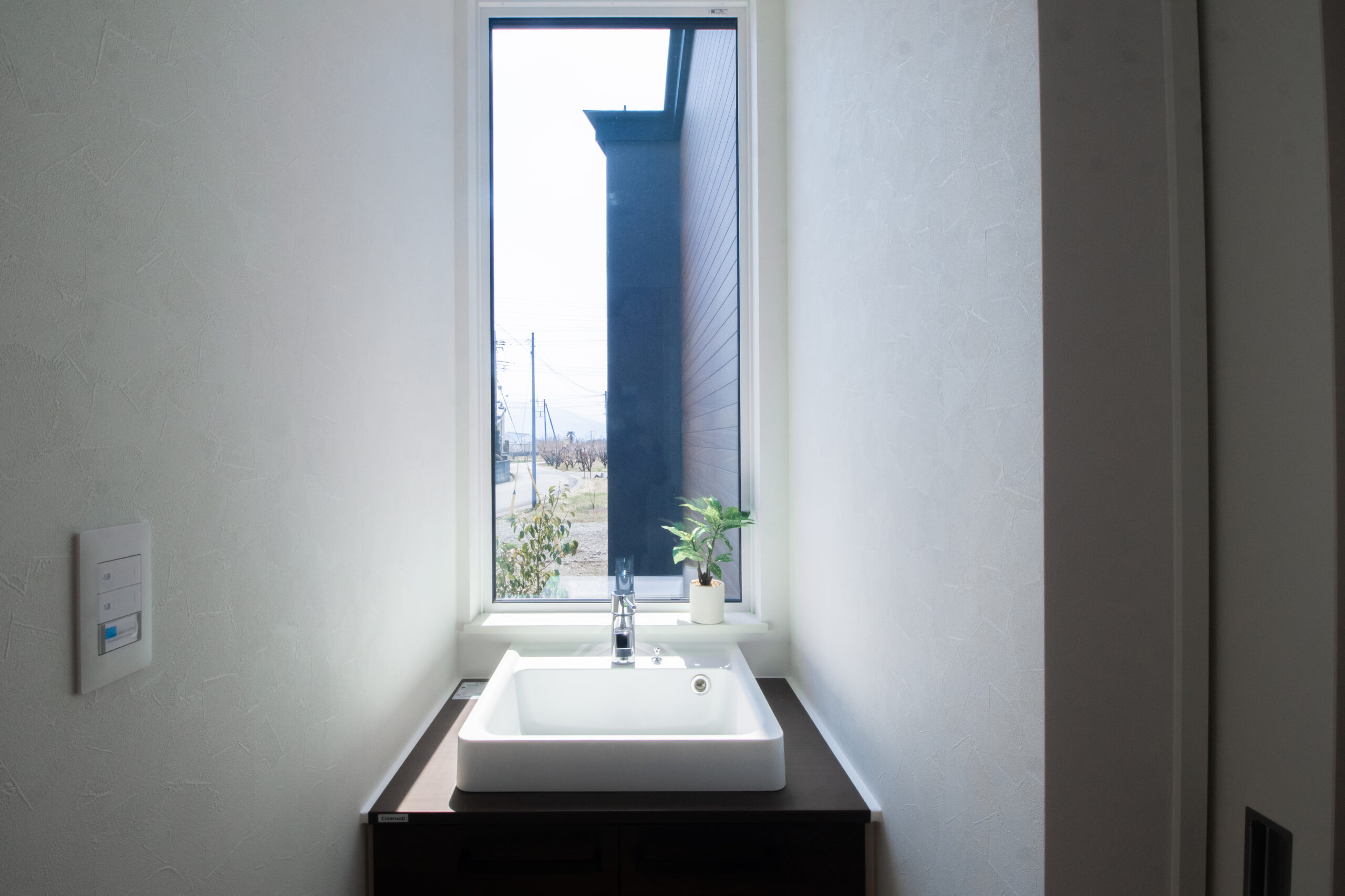 • 洗面台/ 帰ってきてすぐに手が洗えるよう玄関横に配置。正面には窓があり、十分な自然光が空間を照らしつつ建物や木々、澄んだ空や山々などの風景を眺めることができる洗練されたデザインとなっております。
